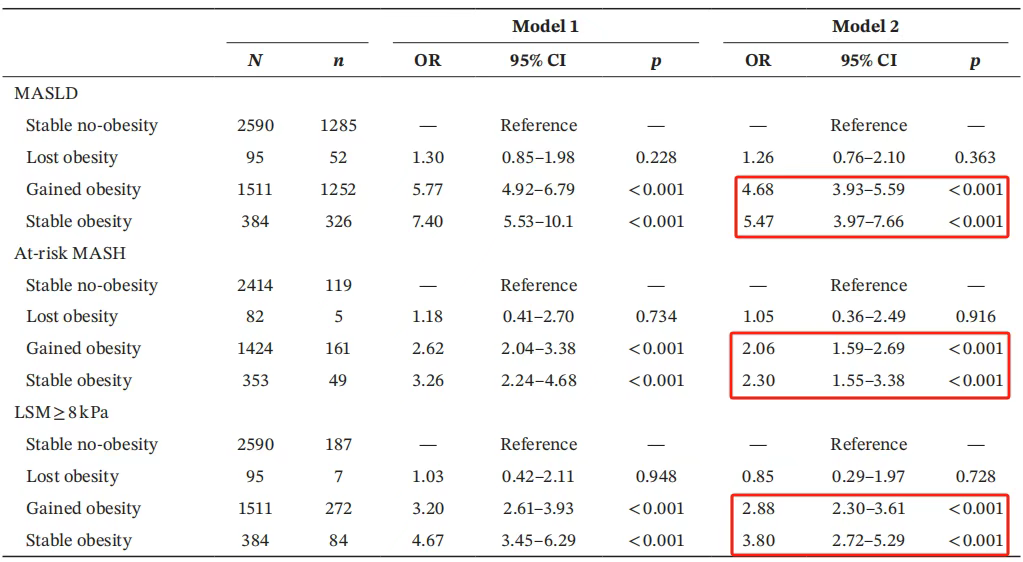 例如,在本次研究中,研究者通过参与者的肥胖现状(与25岁时相比)来估计他们患MASLD、高风险MASH和LSM≥8kPa的风险。并根据参与者不同的特征建立了两个调整模型,模型如下: