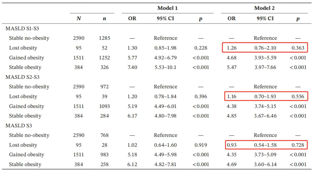 初步分析的结果显示,与稳定型非肥胖者相比,稳定型肥胖和获得性肥胖的人群患MASLD的风险显著增加。