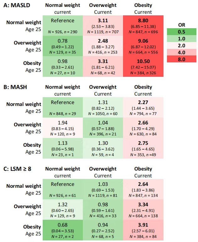 研究结果表明,25岁左右时的肥胖是MASLD、高风险MASH和LSM增加的重要危险因素。然而,在成功减重后,这些增加的疾病风险可回归至正常水平。