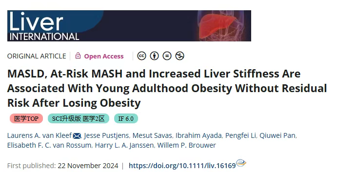 2024年11月22日,外国学者用NHANES数据库,在期刊《Liver International》(医学二区top,IF=6.0)发表题为:“MASLD, At-Risk MASH and Increased Liver Stiffness Are Associated With Young Adulthood Obesity Without Residual Risk After Losing Obesity”的研究论文,旨在探究人群与25岁左右时相比的肥胖现状,与MASLD、高风险的脂肪性肝炎(MASH)和肝硬度测定值(LSM)增加之间的关系。