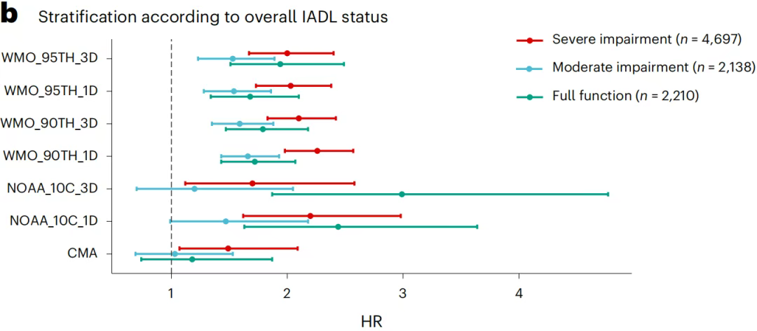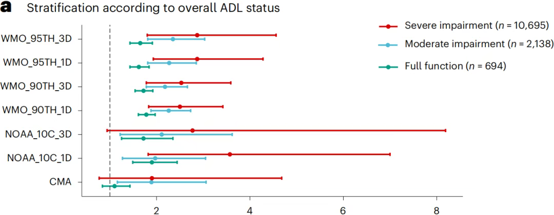 事实上,特定残疾增加了热浪死亡率,如卧床不起(HR=3.20,95%CI=2.11–4.85),无法连续行走1公里(人力资源=2.09,95%CI=1.79–2.45),难以访问邻居(HR=2.39,95%CI=1.93–2.96)和难以乘坐公共交通(HR=1.94,95%CI=1.67–2.24)。