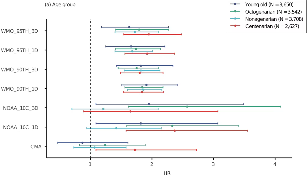 此外,难以保持个人卫生的参与者,包括洗澡(HR=2.31,95%CI=1.81–2.95)和敷衣(HR=2.66,95%CI=1.92–3.69),更容易发生热浪相关死亡。