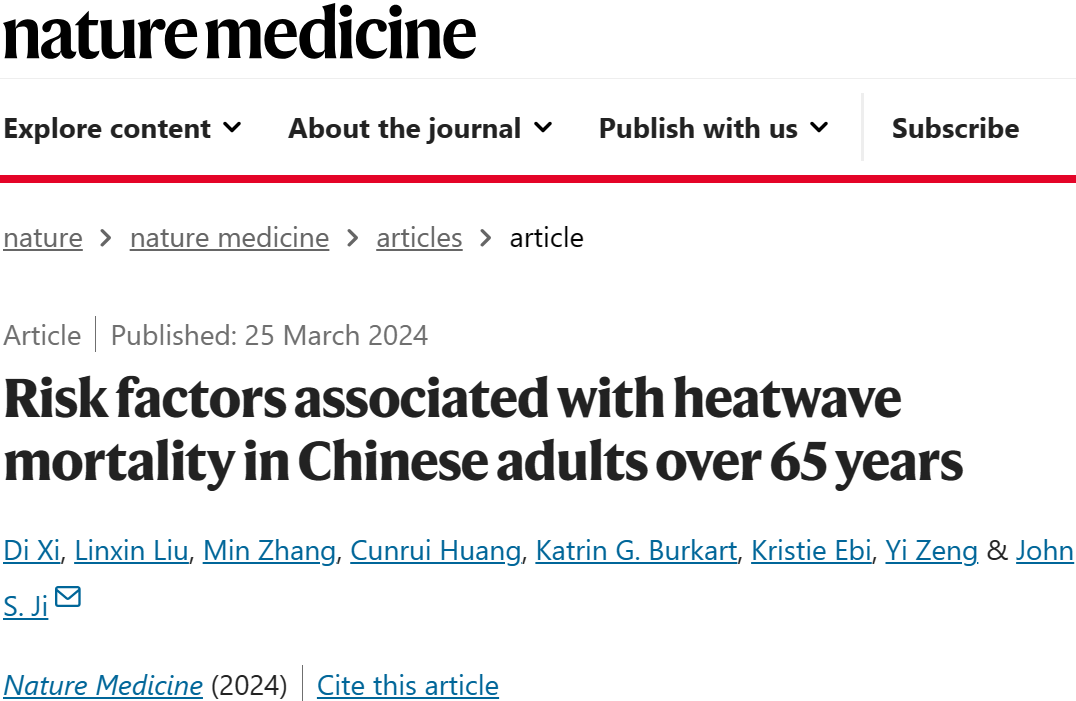 2024年3月,清华大学的研究者在《Nature Medicine》(医学一区top,IF=82.9)刊登了一篇题为:“Risk factors associated with heatwave mortality in Chinese adults over 65 years”的研究论文,探究65岁以上的老年人热浪死亡率相关的危险因素。