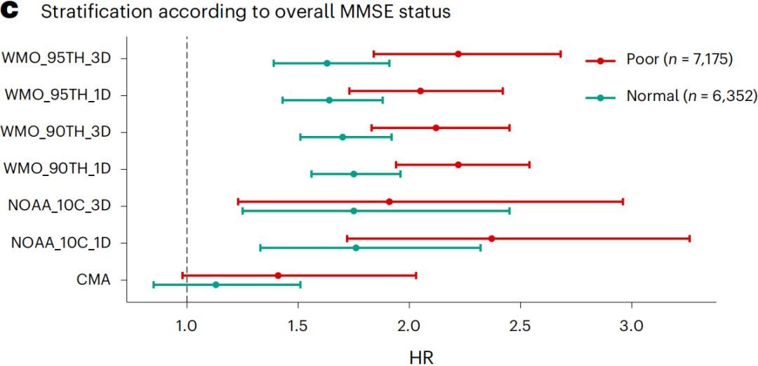 认知能力好的较差的,在热浪期间表现出较强的弹性,即死亡风险较高(表现较好的HR=1.75,95%CI=1.52-1.93,表现较差的HR=2.20,95%CI=1.94-2.50))。