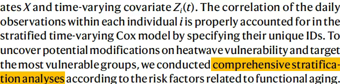 2.分层分析:为了揭示热浪脆弱性的潜在变化,针对最脆弱的群体,根据与功能老化相关的危险因素进行了综合分层分析。