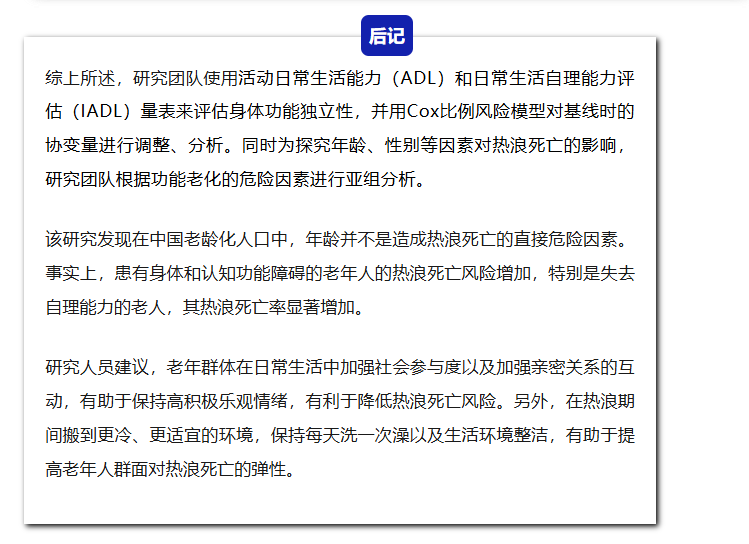 虽然有不少研究针对如何降低热浪死亡率提出来了建议,但先前的研究大多在当地进行,且样本量相对有限不适用于大范围推行。因此,探究功能老龄化相关的因素与老龄化人口的热浪死亡率之间的关系,有助于我们针对气候变化产生健康风险时制定策略,也有助于我们了解与功能老化相关的因素如何影响对热浪的脆弱性。