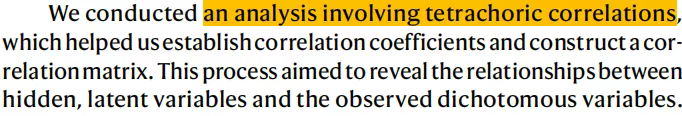 4.四向相关性分析:构建立相关系数和构建相关矩阵。这个过程旨在揭示隐藏的、潜在的变量和观察到的二分变量之间的关系。