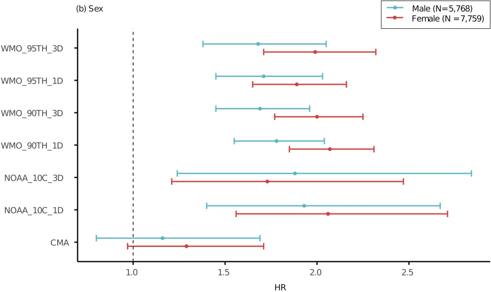 5、热浪相关死亡率的影响有性别特异性,女性受影响更多