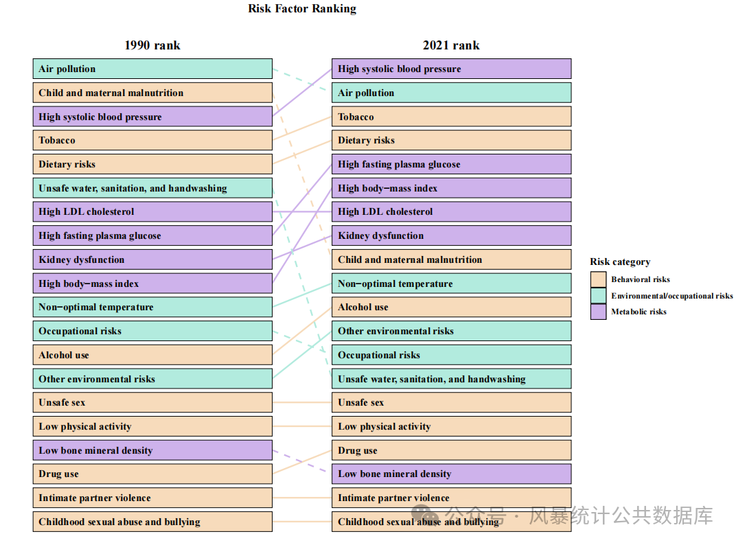 风险因素排名变化图:展示的是某一地区任意两个年份各风险因素的排名变化情况对比。