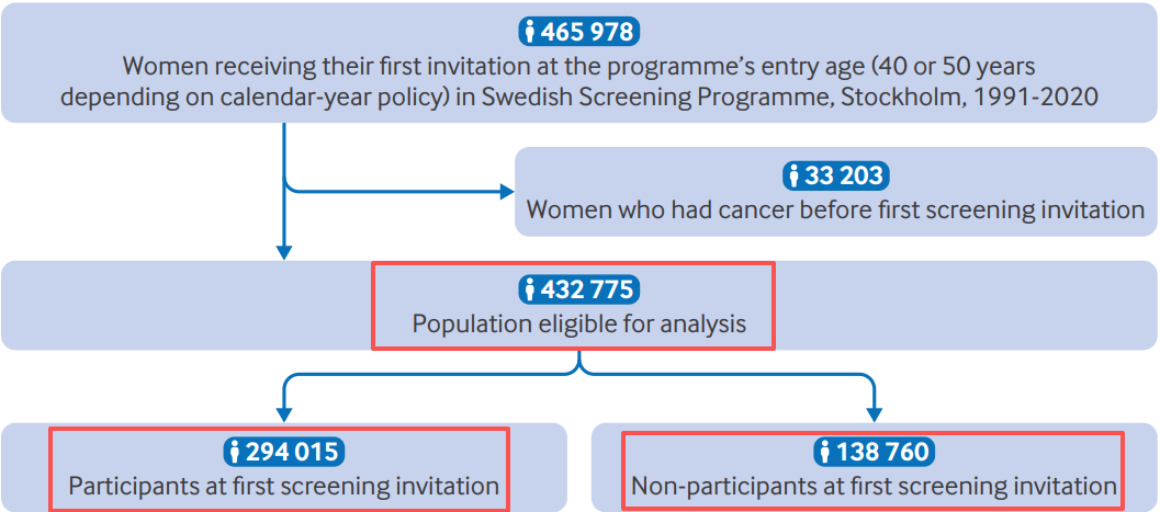 本研究数据来自瑞典乳腺X线筛查登记处与链接的全国登记数据。研究者首先识别了1991年至2020年间曾收到乳腺X线筛查邀请的女性。