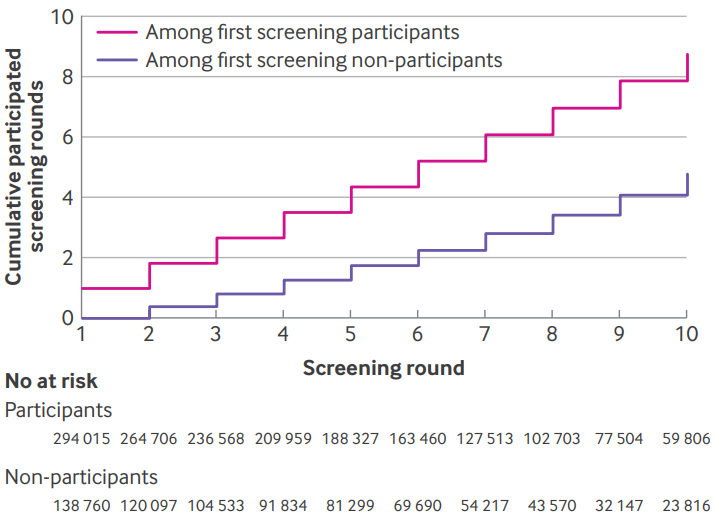 与参与者相比,首次筛查未参加者在后续筛查中更少参加。在10次筛查邀请期间,首次筛查参与者平均参加8.74次筛查(包括首次筛查;95%置信区间 8.72–8.76),而未参加者平均参加4.77次(95% CI 4.73–4.81)。
