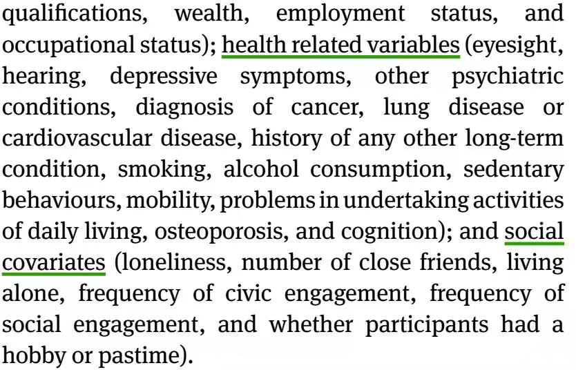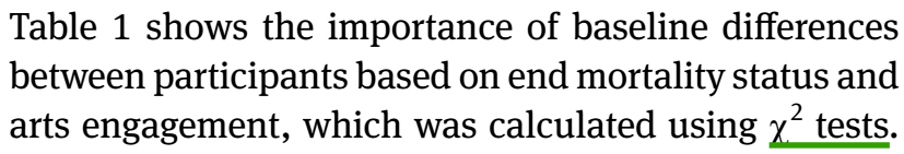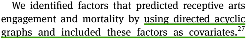 这是个观察性队列研究,研究因素是参与艺术的频率(从不、偶尔、经常),对照组是从不参与艺术活动的人,结局是生存时间资料。由于是观察性研究,有一堆的混杂因素。