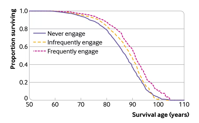 这篇探讨英国人艺术参与的不同频率与死亡率的关系。研究选择了2004-2005年6710名50岁及以上社区居民,随访14年后发现:与从未参与艺术活动的人相比,不断参与包括看电影在内的艺术活动的人在跟随期间的总死亡风险降低了14%,经常参与接受艺术活动的人死亡风险降低了31%。结论是人老了多参与艺术活动,看看话剧、看看电影,都是延年益寿的好事。