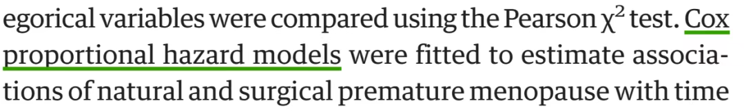 这同样是个观察性队列研究,研究因素绝经特点(绝经时间>40岁、绝经时间<40岁但自然绝经、绝经时间<40岁但手术绝经),对照组是绝经时间>40岁的女性,结局同样是生存时间资料。这个研究显然也有一堆的混杂因素。