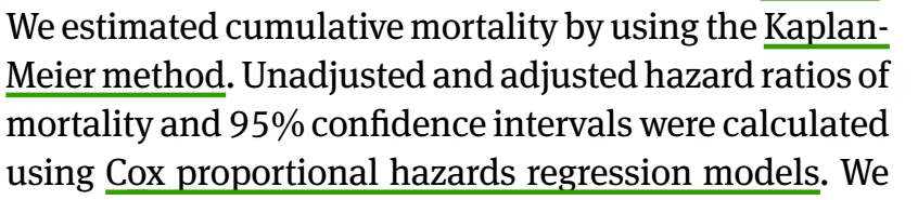 两篇论文都是生存时间资料,具有随访时间和生存结局,对于这类数据,我们一般采用K-M方法和COX回归。这碗酒,JAMA和BMJ也都干了!