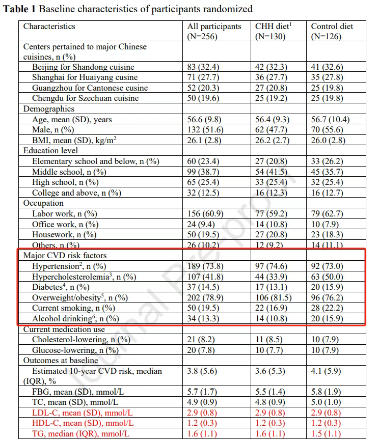 基线时有41.8%人患有高胆固醇血症,有14.5%人患有糖尿病。CHH饮食组和常规饮食组人群的基线特征基本一致。
