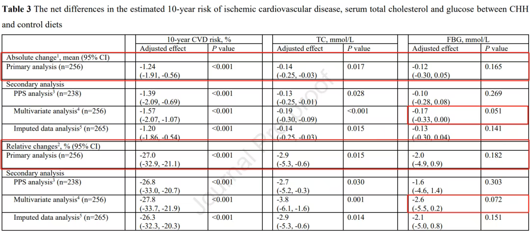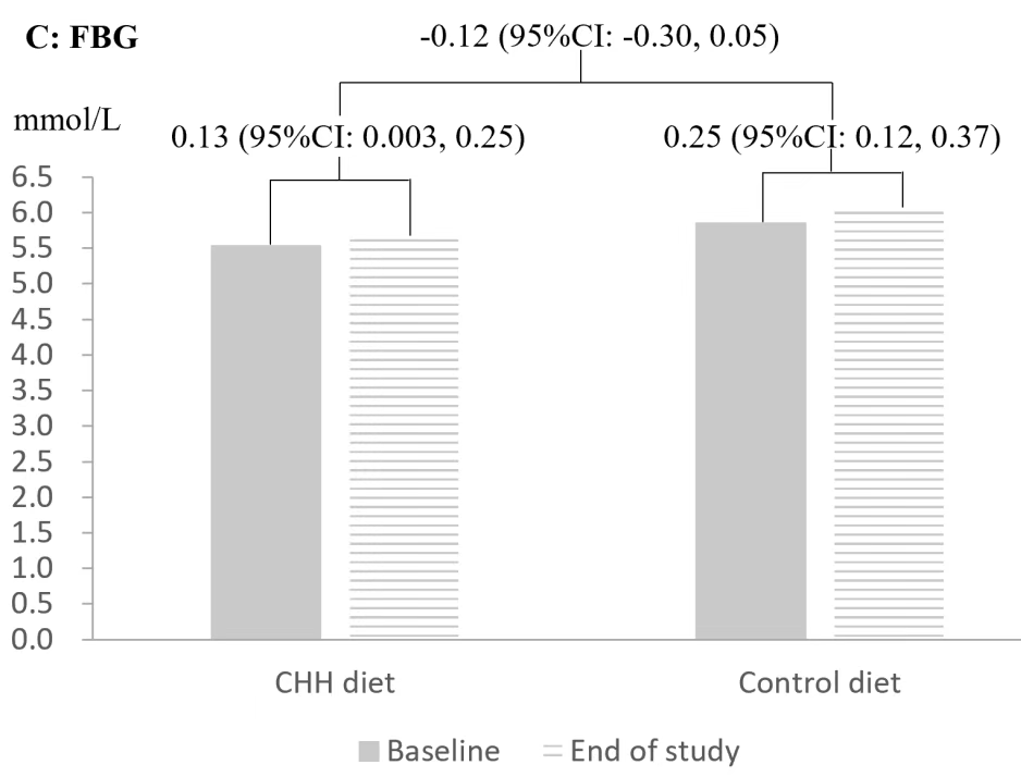 而与TC、估计10年CVD风险的变化相反,在干预结束时,CHH饮食组和常规饮食组的空腹血糖(FBG)水平均有所升高(绝对变化0.13 mmol/L vs. 0.25 mmol/L,相对变化3.2% vs. 5.1%,P均<0.05)。而两组之间绝对和相对变化差异无统计学意义。