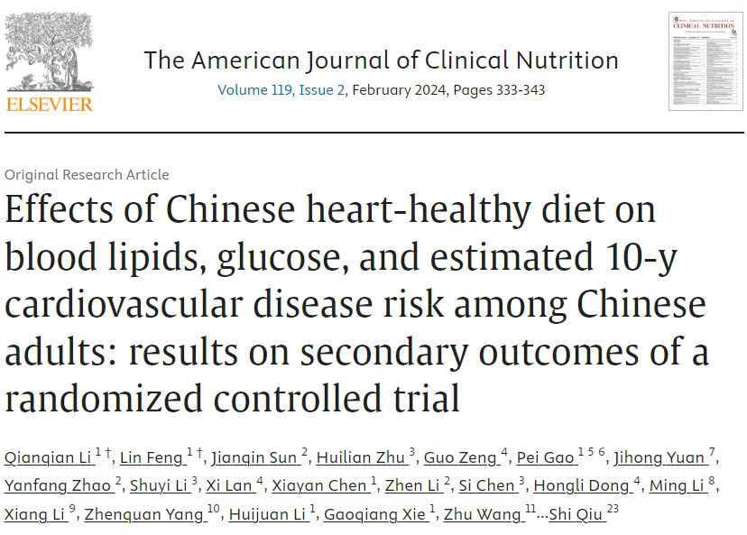 2024年2月,新发表于American Journal of Clinical Nutrition(医学一区,IF=7.1)的一项题为:“Effects of Chinese heart-healthy diet on blood lipids, glucose, and estimated 10-y cardiovascular disease risk among Chinese adults: results on secondary outcomes of a randomized controlled trial”的研究显示,CHH饮食还可显著降低中国人群的总胆固醇(TC)水平和10年CVD风险,并可能降低血糖。