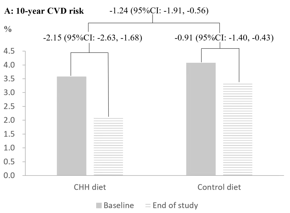 在干预结束时,CHH饮食组和常规饮食组的估计10年CVD风险均有显著降低(相对变化-37.4% vs. -10.4%,P均<0.001)。10年CVD风险绝对降幅和相对降幅在两组之间的差异均具有统计学意义(P均<0.001)。