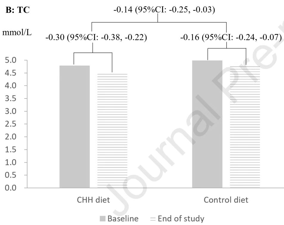在干预结束时,CHH饮食组和常规饮食组的TC均较基线降低(相对变化-5.6% vs. -2.7%,P均<0.05)。TC绝对降幅和相对降幅在两组之间的差异均具有统计学意义(P值分别为0.017和0.015)。