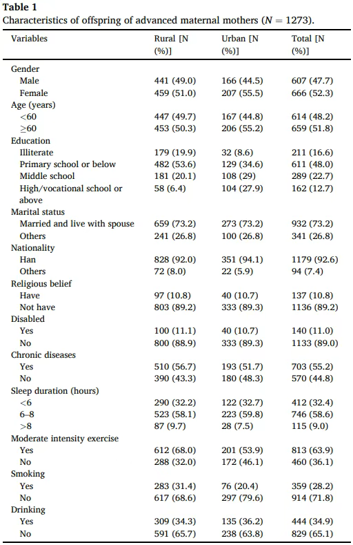 标题:高龄母亲后代抑郁症状的城乡差异及相关因素研究——一项全国性的中国横断面研究