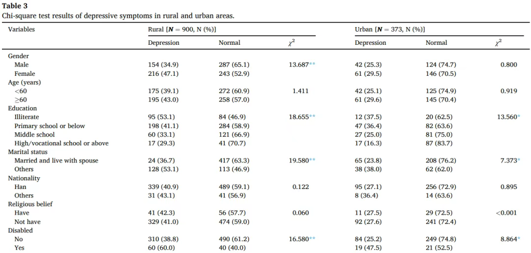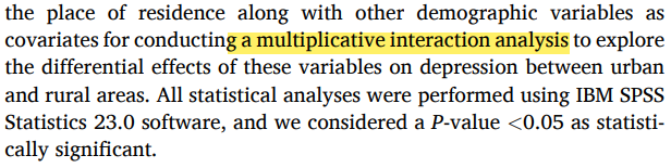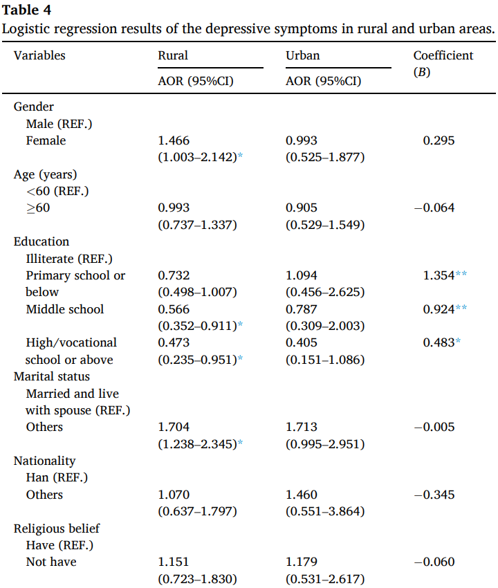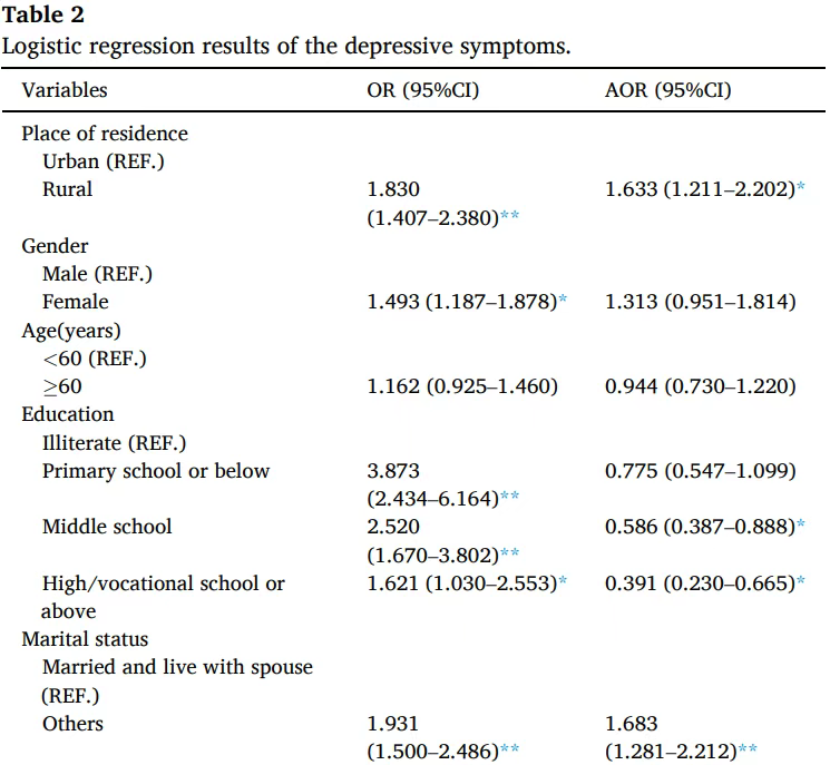 此外,在logistic回归分析中,我们以抑郁症为因变量,并以居住地等人口统计学变量为协变量,进行乘法交互分析,探讨这些变量对城乡抑郁症的差异影响。