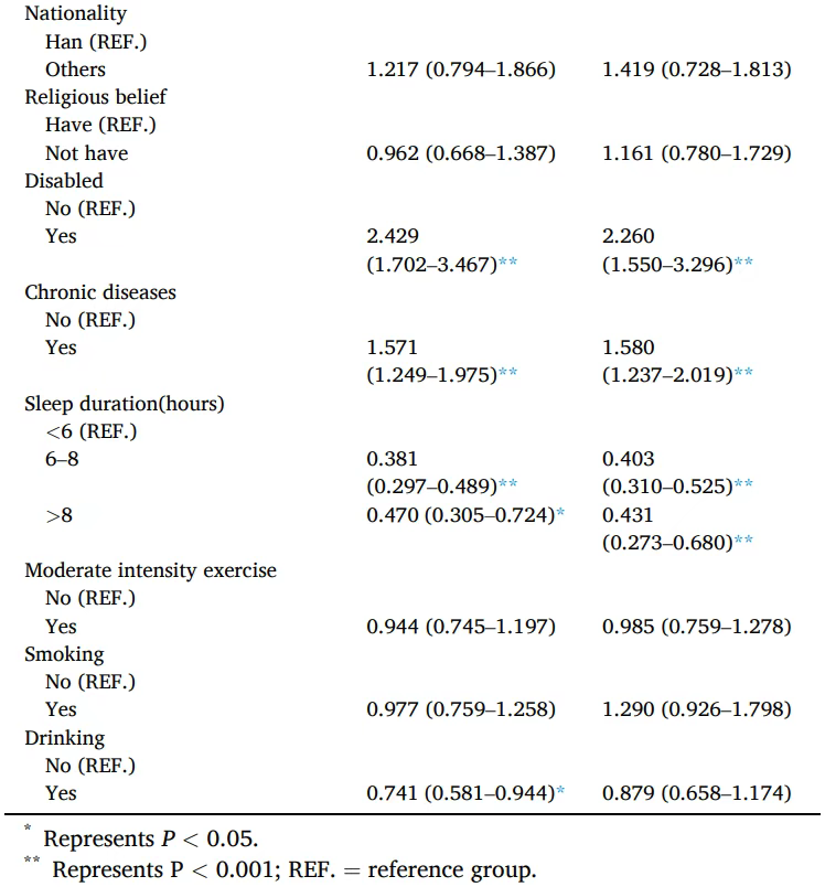 协变量:性别、教育、婚姻状况、残疾、慢性疾病和睡眠时间