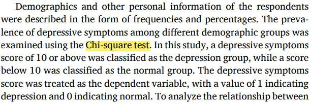 受访者的人口统计和其他个人信息以频率和百分比的形式描述。采用卡方检验检验不同人口统计学组间抑郁症状的患病率。