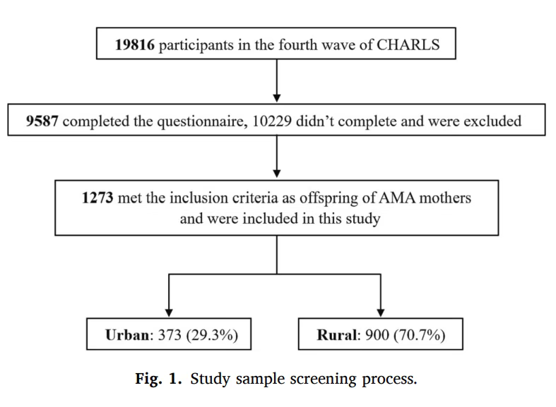 P(Population)参与者:第四波中国健康与养老纵向研究(CHARLS)数据库中,1273名符合条件的高龄产妇所生的后代。