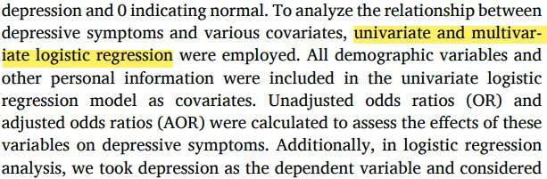 采用单因素和多因素logistic回归分析抑郁症状与各协变量的关系。所有人口统计变量和其他个人信息均作为协变量纳入单变量logistic回归模型。计算未调整优势比(OR)和调整优势比(AOR)来评估这些变量对抑郁症状的影响。