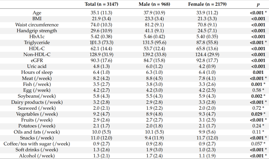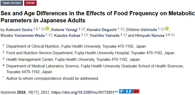 2024年8月27日,期刊《Nutrients》(医学二区,IF=4.8)发表了一篇题为:“Sex and Age Differences in the Effects of Food Frequency on Metabolic Parameters in Japanese Adults”的研究论文。研究发现,饮食偏好对代谢的影响因年龄和性别而异。