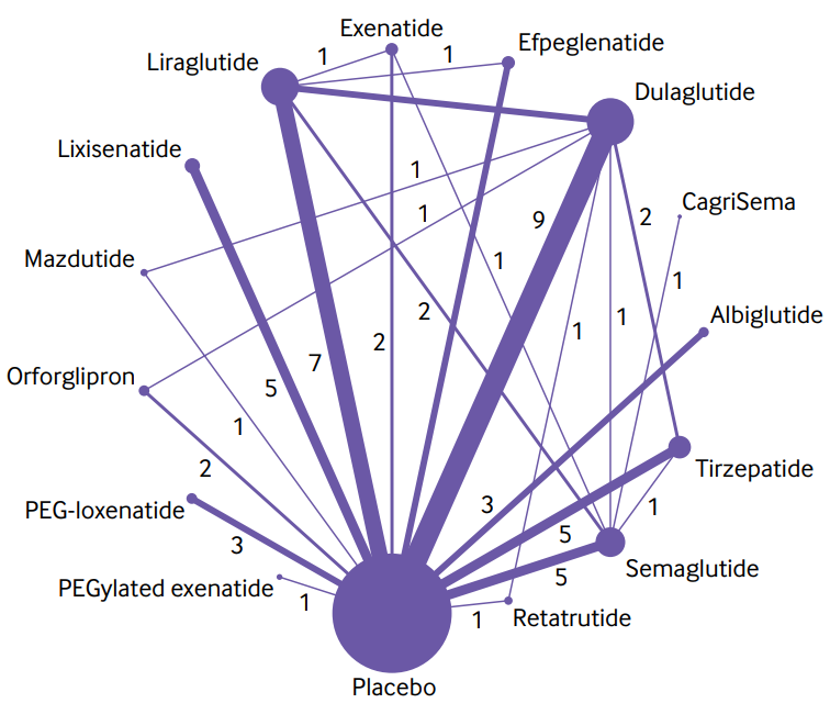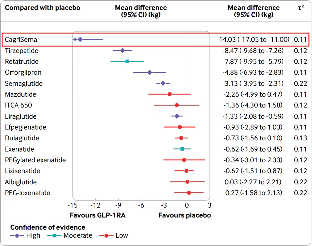 GLP-1RAs被证明对2型糖尿病患者的体重管理有很强的益处。CagriSema(司美格鲁肽联合cagrilintide)的减重效果最好(平均差值为- 14.03kg(95%CI为-17.05至-11.00),证据高置信度),其次是替尔泊肽(tirzepatide)(-8.47kg(-9.68至-7.26),证据高置信度)。单纯司美格鲁肽减重效果排在第5位。
