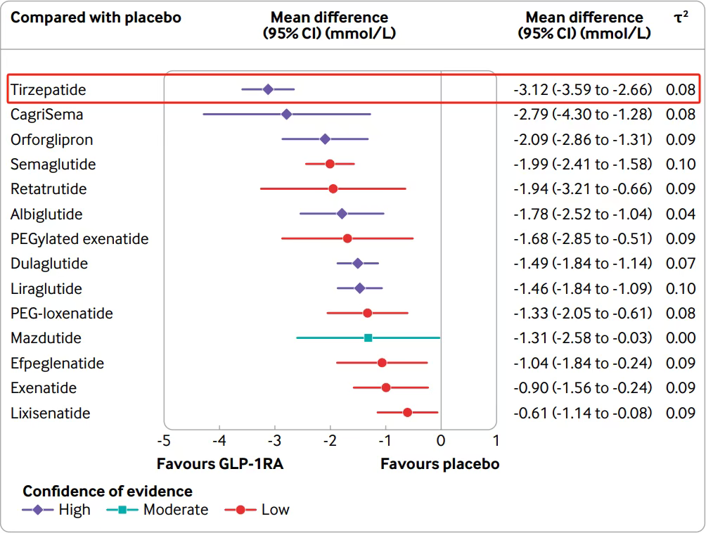 降糖效果,Tirzepatide排第一