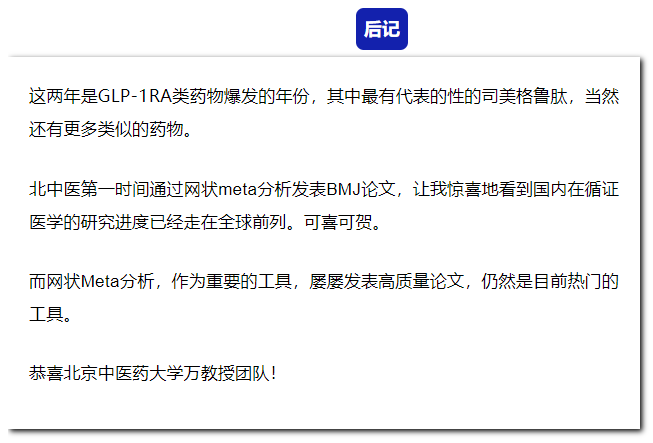北京时间1月30日,北京中医药大学万瑾毅教授团队在《BMJ》上发表了题为“Comparative effectiveness of GLP-1 receptor agonists on glycaemic control, body weight, and lipid profile for type 2 diabetes: systematic review and network meta-analysis”的论文,以评价GLP-1RAs对成人2型糖尿病患者血糖控制、体重和血脂的比较疗效和安全性。