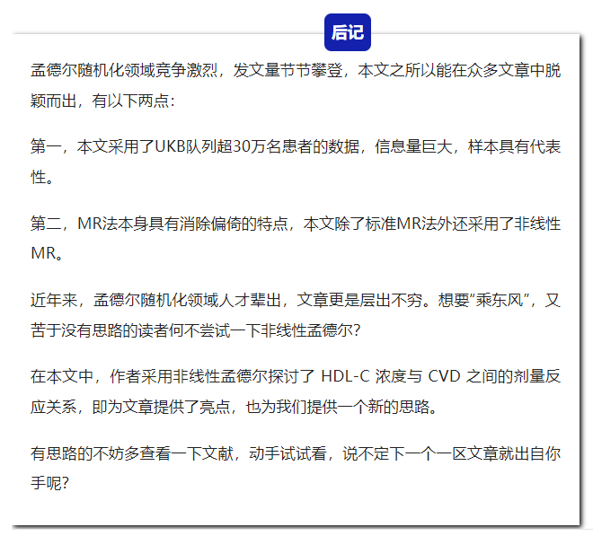文章题目:高密度脂蛋白胆固醇与心血管疾病之间的非线性关系:观察性和孟德尔随机化分析