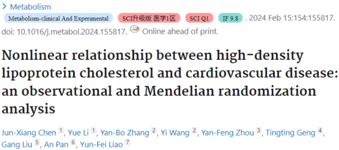 2024年2月,华中科技大学公共卫生学院学者在《Metabolism-clinical and Experimental》(一区,IF=9.8)发表题为:"Nonlinear relationship between high-density lipoprotein cholesterol and cardiovascular disease: an observational and Mendelian randomization analysis" 的研究论文。
