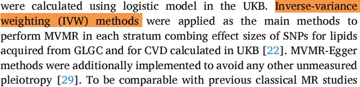 采用逆方差加权(IVW)方法作为主要方法,对GLGC获得的脂质和UKB计算的CVD的SNPs梳理效应大小进行MVMR。