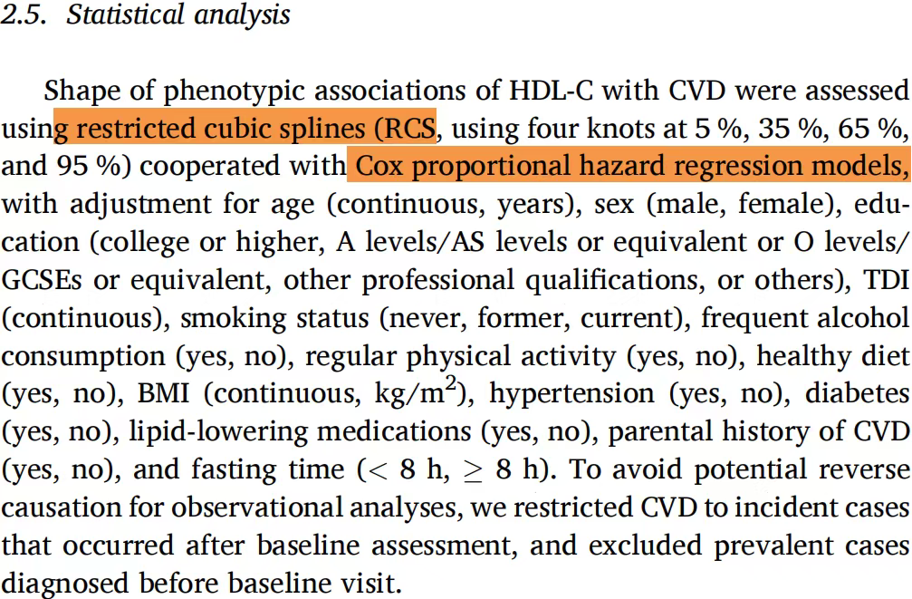 联合使用限制性立方样条(RCS)与Cox比例风险回归模型揭示HDL-C与CVD的表型关联的形状。