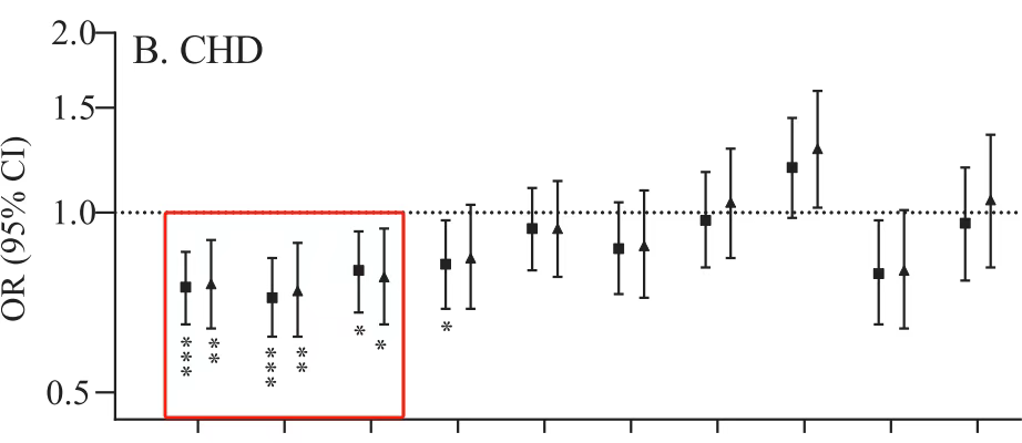 通过对LDL-C和TG的多效性效应的调整,分层多变量MR(MVMR)结果显示,在HDL-C < 50 mg/分层中,HDL-C与CVD(OR每单位增加0.86、95 % CI、0.79–0.94)、冠心病(OR每单位增加0.85、95 % CI、0.77–0.94)和中风(每单位增加0.85、95 % CI、0.75–0.96)呈显著负相关。相比之下,在任何其他与HDL-C浓度较高的地层中,都没有观察到显著的关联。