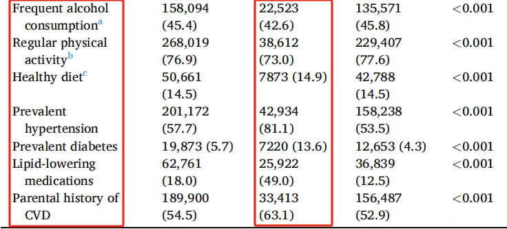 与没有CVD事件的参与者(n=295717)相比,患有CVD的参与者(n=52919)特征为老年人、男性、社会经济贫困、现在或以前吸烟、不经常饮酒、不运动,并且饮食更健康、BMI和TG水平更高、HDL-C和LDL-C水平更低,患有高血压、糖尿病,使用降脂药物以及父母有CVD病史。