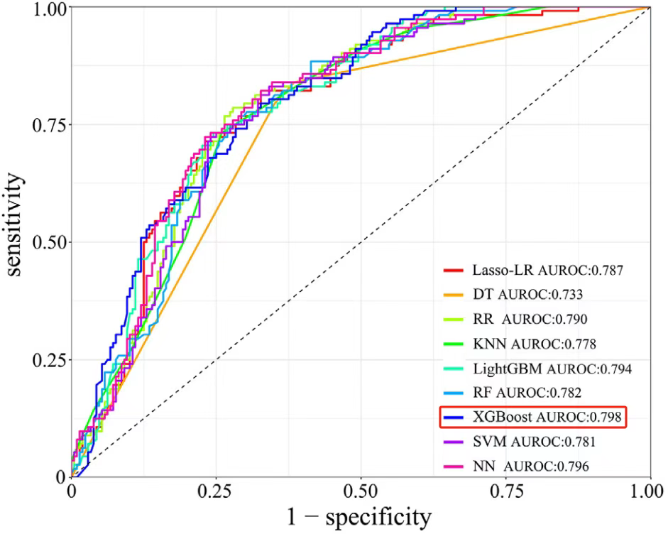 研究团队共使用了9个模型,包括最小绝对收缩和选择算子逻辑回归(Lasso-LR),决策树(DT),岭回归(RR),K-最近邻(KNN),光梯度增强机(LightGBM),随机森林(RF),极端梯度增强(XGBoost),支持向量机(SVM)和神经网络(NN)。