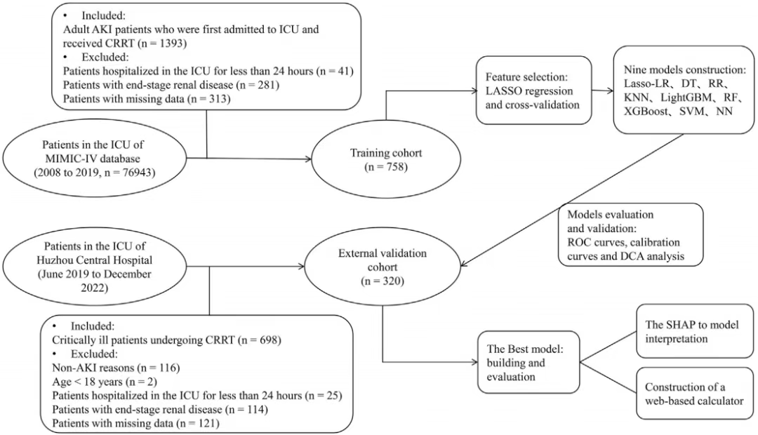 本项研究纳入了MIMIC-IV的数据758名年龄≥18岁、确证为AKI并接受CRRT的符合条件的参与者用于模型开发,并从湖州市中心医院重症监护病房(ICU)纳入320名符合同样条件的参与者用于模型验证,所有人群的平均年龄为(63.79 ± 16.03)岁,SOFA(序贯器官衰竭评估)评分为(11.67 ± 4.25)。