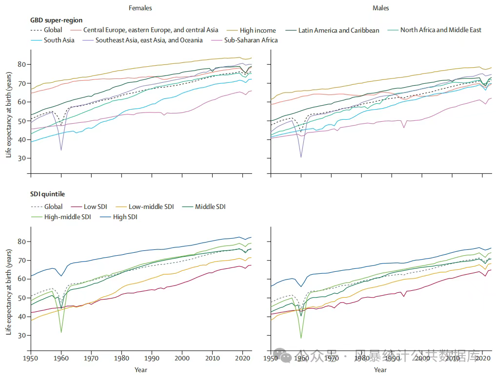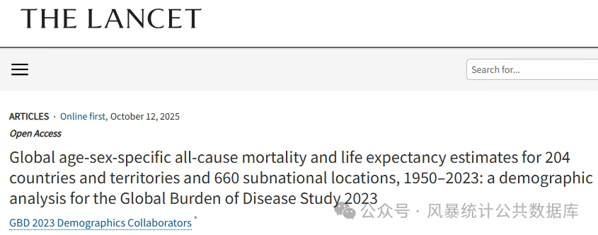 2025年10月12日,GBD 2023人口统计学合作者用GBD 2023数据库,在医学顶刊Lancet主刊(医学一区Top,IF=88.5)发表题为:“Global age-sex-specific all-cause mortality and life expectancy estimates for 204 countries and territories and 660 subnational locations, 1950–2023: a demographic analysis for the Global Burden of Disease Study 2023”的研究论文。