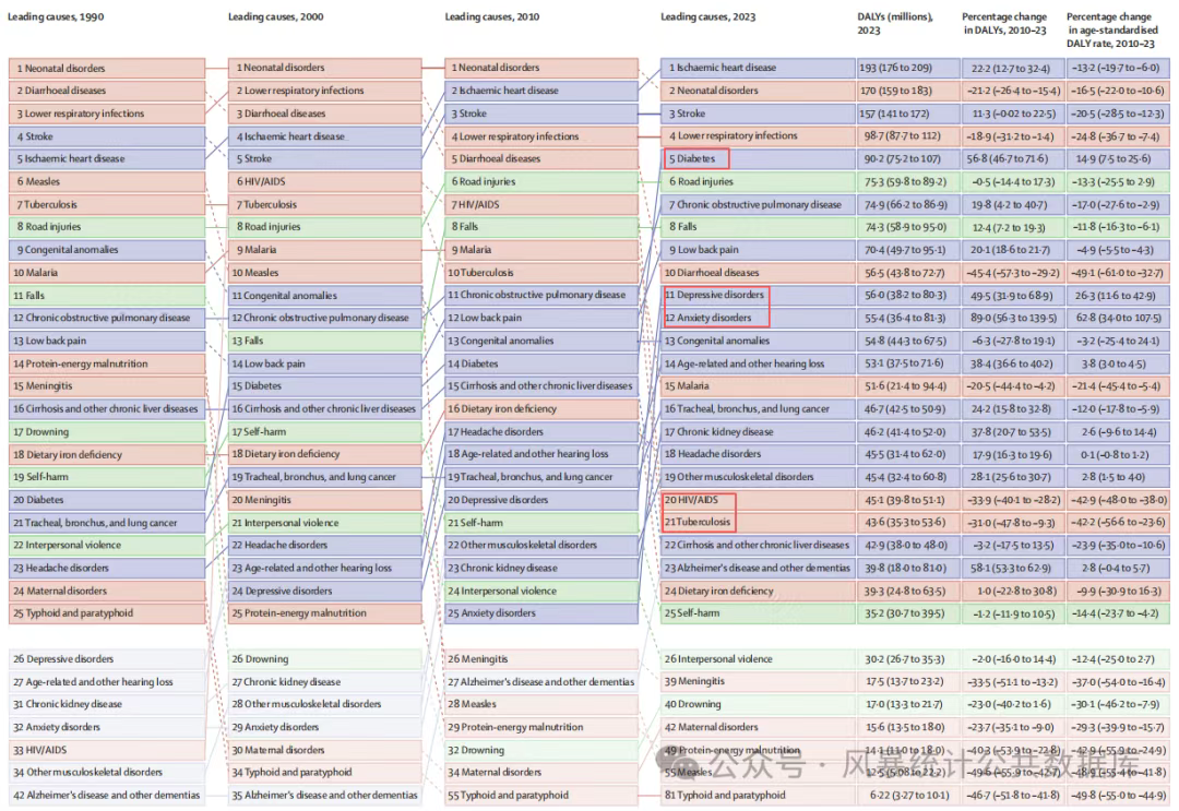 图3 1990年、2000年、2010年和2023年,导致DALYs的前25个三级疾病原因