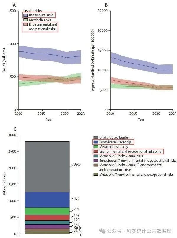 此外,风险因素中,代谢风险相关的DALY计数增加30.7%,但年龄标准化率下降6.7%;行为和环境职业风险的年龄标准化率分别下降22.2%和27.3%。