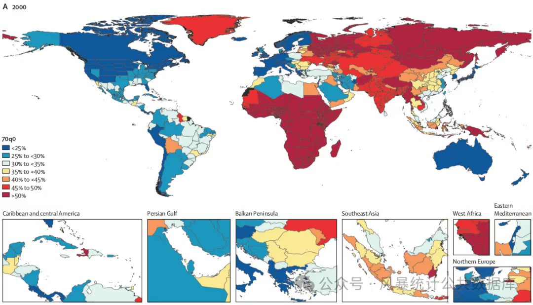 此外,在2000–2023年间,70q0在各GBD区域普遍下降,但药物使用障碍、糖尿病等非传染性疾病导致部分地区(如撒哈拉以南非洲)的70q0上升。
