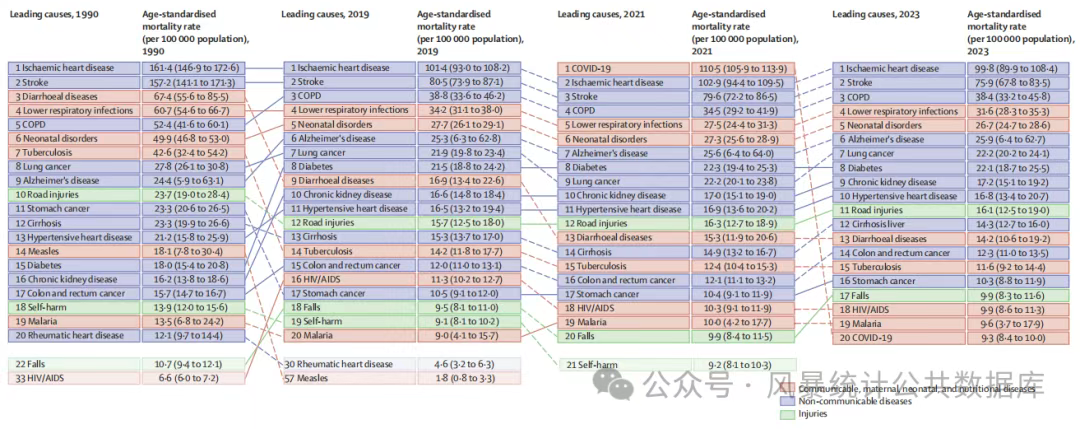 具体而言,COVID-19在2021年成为GBD三级死因中年龄标准化死因的首位,至2023年降至第20位。