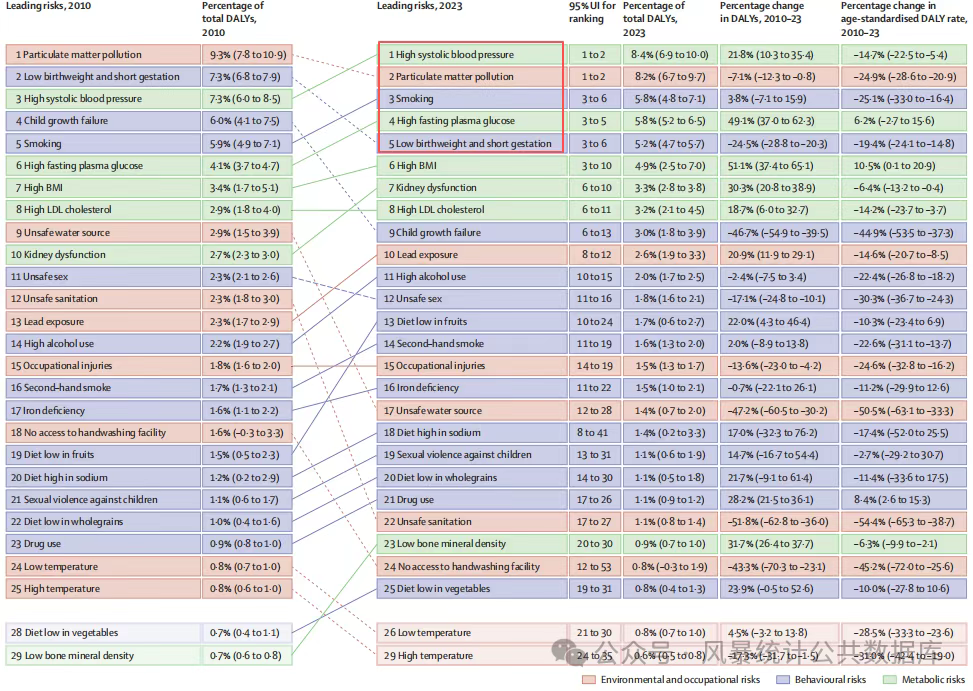 值得注意的是,2023年全球DALY中约45.5%可归因于88种风险因素,前五位分别是高血压、颗粒物污染、吸烟、高空腹血糖和低出生体重与早产。