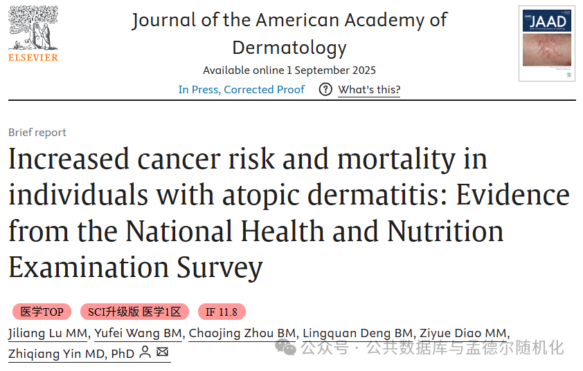 2025年8月27日,南京医科大学硕士用 NHANES 数据库,在期刊《Joumal of The American Academy of Dermatology》(医学一区Top,IF=11.8)发表了一篇题为:“Increased Cancer Risk and Mortality in Individuals with Atopic Dermatitis: Evidence from the NHANES”的研究论文。旨在探究特应性皮炎(AD)与癌症之间的关联,以及二者共同存在时对全因死亡率的综合影响,从而为AD相关的健康后果提供新的见解。