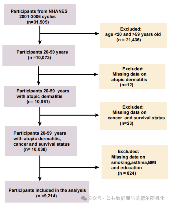 研究基于美国国家健康与营养调查(NHANES)2001–2006年的数据,经过纳排,共纳入9214名年龄20-59岁、有可用AD数据的参与者。